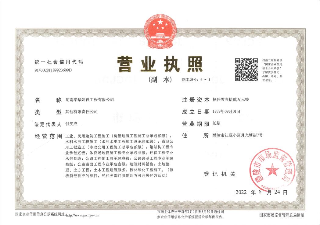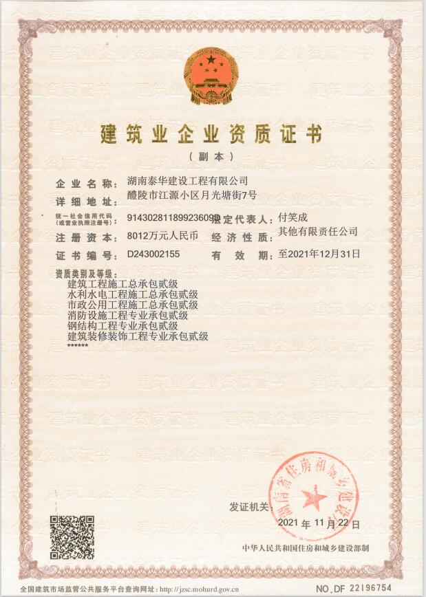 湖南泰華建設工程有限公司一家房屋建筑工程施工總承包貳級,水利水電工程施工總承包貳級,市政公用工程施工總承包貳級,鋼結構工程施工專業承包二級,消防設施工程專業承包貳級,建筑裝修裝飾工程專業承包貳級;公路工程施工總承包叁級,鋼結構、體育設施、環保工程、公路路面工程、公路路基工程專業承包叁級企業?!?/div>
